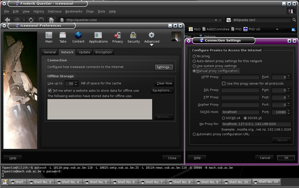 ssh -L 10080:proxy.vub.ac.be:80 -L 10025:smtp.vub.ac.be:25 -L 10110:pop.vub.ac.be:110 -N mach.vub.ac.be